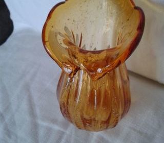 a vendre joli petit vase en verre soufflé jaune d'or plein de bulles. Il est neuf n'a jamais eu d'eau pour mettre des fleurs. Sa forme corole sur le dessus est du plus bel effet