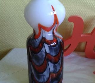 A vendre joli vase en opaline vintage orange noir et blanc de Florence made in Italy . Sa forme peu courante fait de lui un objet plutôt contemporain qui s'intégrera dans un inté