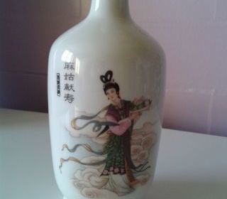 A vendre bouteille en porcelaine décor de geisha des années 80. La foire de Dijon avait invité la Chine et elle a été achetée à ce moment là..pour la petite histoire. Hauteur :