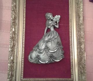 A vendre magnifique cadre bois doré fond velours bordeaux étain Petit Prince. Il représente une belle dame en robe de soirée jouant de l'éventail. Le cadre bois doré est en par