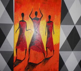 tableau africain de très jolie couleur représente 3 africaines qui danse peint