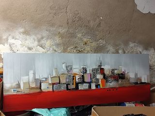 Doit faire 1m50 x 50 cm Fond gris et rouge avec dessin représentant comme des immeubles formes de cubes