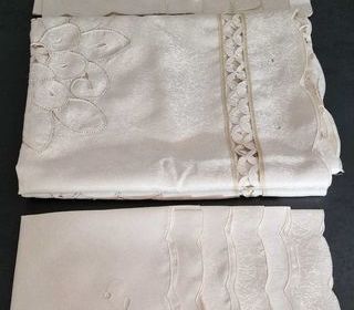 Service de table ancien Très grande nappe rectangulaire beige avec broderie dorée et les 12 serviettes assorties Dimensions nappe 2m62 x 1m75 Dimensions serviettes 43 cm x 43 cm
