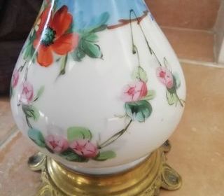 Lampe à pétrole ancienne, décor floral peint à la main.