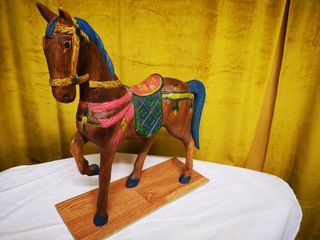 Cheval en bois peint ( sur socle par sécurité, mais tient debout sans). Hauteur ~ 44 cm. L : 40cm