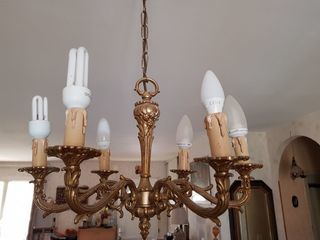 A vendre un lustre en bronze, composé de six culots . Les culots sont à l'intérieur des décorations en forme de bougies. Le lustre est vendu avec ampoules, système d'accroche stand