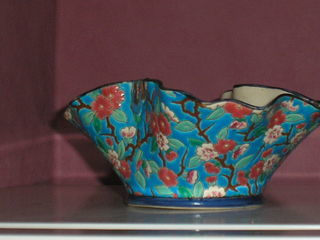Cache pot en émaux de Longwy- ancienne corbeille transformée- longueur 19 cm - largeur 11 et 15 cm - hauteur 8 cm quelques taches et craquelures intérieures dues à son anciennet