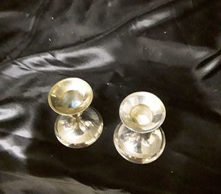 2 PETITS BOUGEOIRS EN MÉTAL ARGENTÉ EN PARFAIT ÉTAT. DIMENSIONS HAUTEUR 10 CM LARGEUR 6 CM A RETIRER SUR PLACE RÈGLEMENT EN ESPÈCES.