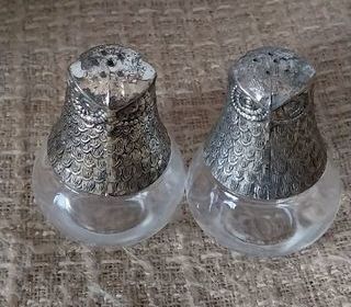 Paire de salières poivre hibou en verre transparent avec capuchons en métal argenté orné de motifs texturés. Les capuchons présentent des perforations pour la dispersion du sel.