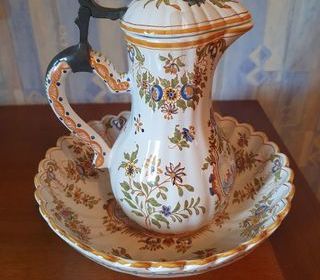 PICHET CRUCHE AVEC COUVERCLE ARTICULE ETAIN ET BASSIN EN FAÏENCE ACHARD A MOUSTIERS Pichet Cruche avec couvercle articulé Etain et bassin en faïence ACHARD Moustiers en parfait