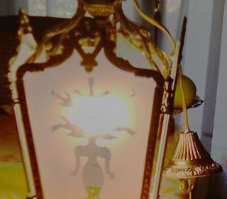Lustre en bronze doré et verre opaque avec dessin incrusté. décore un couloir ou autre pièce. Bon état.