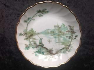 BELLE COUPELLE VIDE POCHE TRÈS RAFFINÉ DE FORME RONDE REPRÉSENTANT UN PAYSAGE AVEC PÊCHEURS DANS DES TONS VERTS AVEC UN LISERÉ DORÉ SUR LE POURTOUR. DIAMÈTRE 13,6 cm HAUTEUR 2