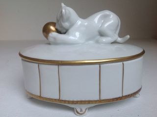BOITE EN PORCELAINE LIONCEAU GEROLD & CO TETTAU Envoi Possible ANCIENNE BOITE A BIJOUX SUR PIED GEROLD & CO TETTAU EN PORCELAINE AVEC LIONCEAU JOUANT AU BALLON, DATANT DES ANNÉE