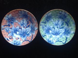 2 TRÈS BELLES COUPELLES À RIZ SAKÉ EN PORCELAINE DE CHINE SIGNÉES AUX MOTIFS FLEURS BLEUES BLANCHES ET FOND HARMONIEUSEMENT COLORÉS EN SAUMON OU VERTE TACHETÉES AVEC FIN LISERÉ EN