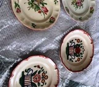 Ensemble faïence décorative, 3 pièces (soupière, couvercle, plat), décor fleurs. "Artisans faïenciers" SE MASSE, faïences de Desvres (Pas-de-Calais). Reproduction de faïences d