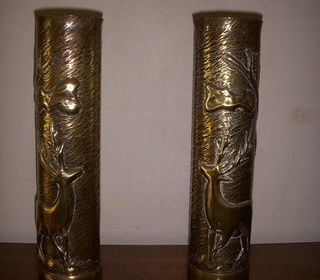 Deux douilles d'obus 75 mm sculptées en cuivre, représentant chacune un cerf.