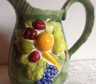 PICHET A FRUITS CALYPSO Envoi Possible DANS LE STYLE SAINT CLÉMENT OU FITZ & FLOYD DIMENSIONS : HAUTEUR ANSE 22 cm, CIRCONFÉRENCE AU PLUS LARGE 48 cm, BEC VERSEUR HAUTEUR 20,