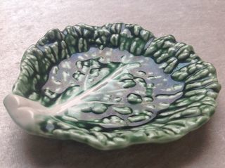 COUPELLE VIDE POCHE FEUILLE DE CHOU EN FAIENCE ORIGINAL COUPELLE VIDE POCHE VINTAGE EN FORME DE FEUILLE DE CHOU . DIMENSIONS : DIAMÈTRE 11 cm, HAUTEUR 2 cm.