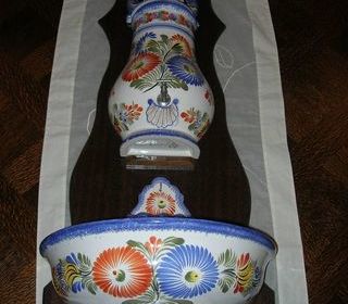 FONTAINE HENRIOT faïence de QUIMPER peinte à la main DECOR D 207 avec vasque, porte, savon, robinet, sur socle en bois à fixer dimensions 1 m x 0,37 cm