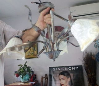 Cause déménagement particulier vend un beau lustre en fer forgé cerusé bleu reflets bronze (or) trois branches 3 corolles blanches reflets jaunes et 3 fleurs en verre jaune de Mur