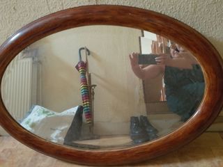 Miroir ovale biseauté. Longueur 90 cm, largeur 65 cm. Entourage bois vernis. Visible à Bacalan. Paiement cash. PAS d'envoi.