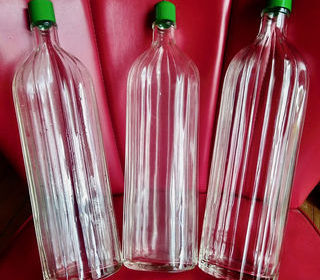 3 bouteilles d'un litre pour eau de Cologne CHERAMY bouchons d'origine ( bakélite verte 2 avec verseur ) années 50/60 pour salon de coiffure Ht : 35 cm prix de l'ensemble : 35