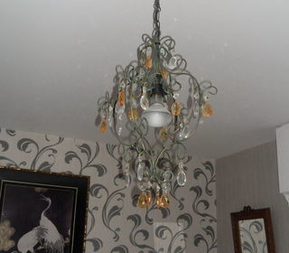 BEAU lustre avec pendeloques en verre orange, vert et blanc avec ampoule à enlever