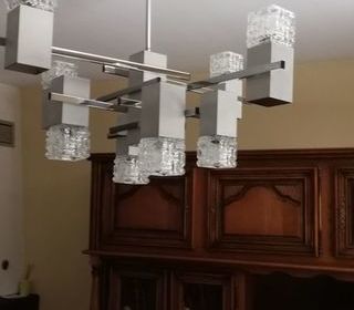 Lustre vintage inox, style Gaetano Sciolari, 8 globes cubiques, câblé double allumage, en parfait état
