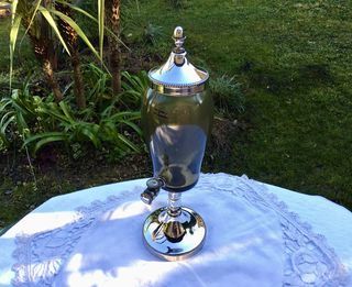 Ancienne fontaine à liqueur (milieu XXème). Le verre fumé est un verre soufflé bouche. Dimensions : - Hauteur : 39 cm - Diamètre : 12 cm Ancienne argenterie en parfait état, e