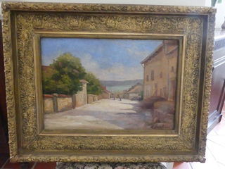 M. DESCHAUX (XIXe) "Rue de village" huile sur toile 38 x 55 cm cadre d'époque en bois stuqué et doré