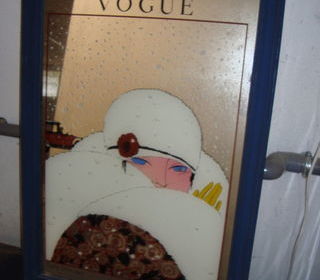 Très beau miroir peint représentant une couverture de "VOGUE 1919"que j'ai depuis les années 60.Le miroir est en très bon état à part un petit manque restauré à l'?il et ses dimens
