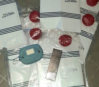 Lot de 7 boîtes cadeaux Collector Avec pompon Rouge en satin Neuf dans emballage d'origine dimensions 24 X 11 cms JEAN PAUL GAULTIER + 1 PORTE MONNAIE JEAN'S + 1 GEL DOUCHE