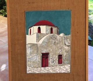 C'est une ?uvre d'art originale et unique, signée par l'artiste Francoise Alexopoulos, datant des années 80 et représentant l'église Agia Anna à Mykonos. Lumineuse et chaleureuse