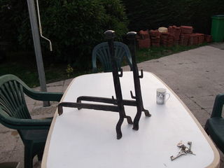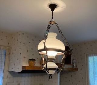 Vendons lustre de cuisine trois branches en très bon état en forme de lampe à pétrole. Matières: Bronze/verre Enlèvement et règlement sur place