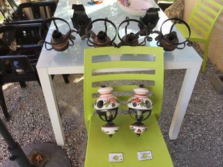 Lot de 4 appliques en fer forgé soit : 1 paire d'appliques murales simples avec abat-jour en porcelaine 1 paire d'appliques murales fer forgé et cuivre doubles têtes Possi
