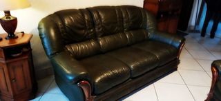 Salon de couleur verte en cuir véritable composé d'un canapé 3 places convertible avec matelas et de 2 fauteuils assortis.