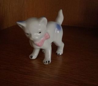 Bonjour, vend magnifique petit chat vintage en céramique , ornée de petite tâche bleue sur le corps et d'un petit n?ud rose ( peint à la main )