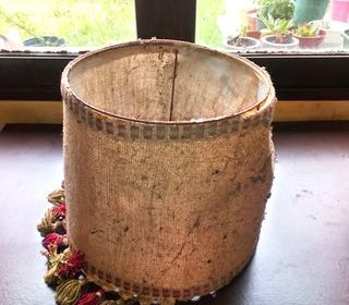 Abat-jour cylindrique en toile de jute, orné de pompons multicolores à la base. L'article présente une texture naturelle et est idéal pour une lampe de table ou de sol.