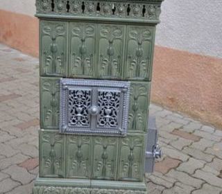 Vend fourneau faïence couleur vert avec tablette en marbre Compartiment chauffe plat Chargement sur le coté Dimension: H100, lg 50, P 40 cm demande une remise en état