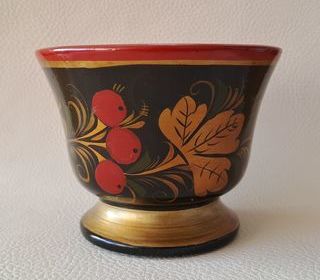 bol décoratif en bois laqué noir rouge or avec décoration floral artisanat russe Khokhloma URSS mis à part une petite égratignure le bol est impeccable hauteur 8 cm diamètre à la