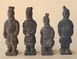 lot de 4 figurines en terre cuite couleur gris noir avec un lavis vieilli qui donne l'impression d'être sorti de terre représentant des guerriers chinois de l'armée de l'empereu
