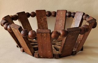 ancien panier corbeille à fruit vintage composé de perles et de plaques de bois cerclage en fil de fer l'ensemble est maintenu et solide, bois patiné par le temps, à restaurer
