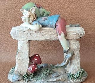 lutin troll farfadet korrigan elfe en habits rapiécés couché sur un banc ou dolmen en pierre longueur 9 cm largeur 4 cm hauteur 9,5 cm