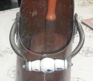 Seau à charbon en cuivre avec pelle à charbon ? collector ou décoration Les poignées sont ornées à leurs bases par des dragons et par des rouleaux en porcelaine Dimensions en ce