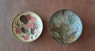 lot de 2 coupelles vide poche en métal laiton gravé et émaillé thème de la nature fleurs et coquilles la plus petite à gauche fait 2 cm de haut et 9 cm de diamètre la