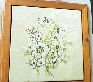 Dessous de plat faisant aussi office d'accroche (trois petits picots en bois, pour torchons, maniques ou ustensiles de cuisine). A suspendre (accroche en corde) En faïence avec c