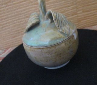 Petit pot à couvercle en grès émaillé de couleur verte tirant sur le beige. Couvercle en forme de feuilles et pédoncule Hauteur : 8 cm Etat impeccable, aucun éclat