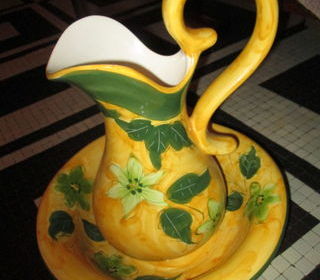 Broc et cuvette en faience, motifs de fleurs et feuilles jaune et vert. Hauteur du broc : 35 cm Hauteur de la cuvette : 9 cm Diamètre de la cuvette : 33 cm Etat impeccable.