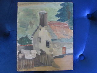 Tableau huile sur bois représentant une maison, avec une cour et du linge étendu qui sèche, un arbre. Non daté et non signé (années 50/60 probables) Dimensions : 22 x 27 cm Très