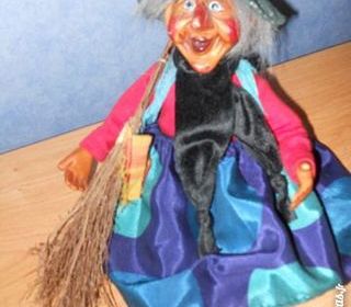 Jolie sorcière assise avec le sourire, le chapeau et son fameux balai. Hauteur de la sorcière à partir de son chapeau : 28cm. Elle est habillée d'un pantalon noir, d'une jupe ver